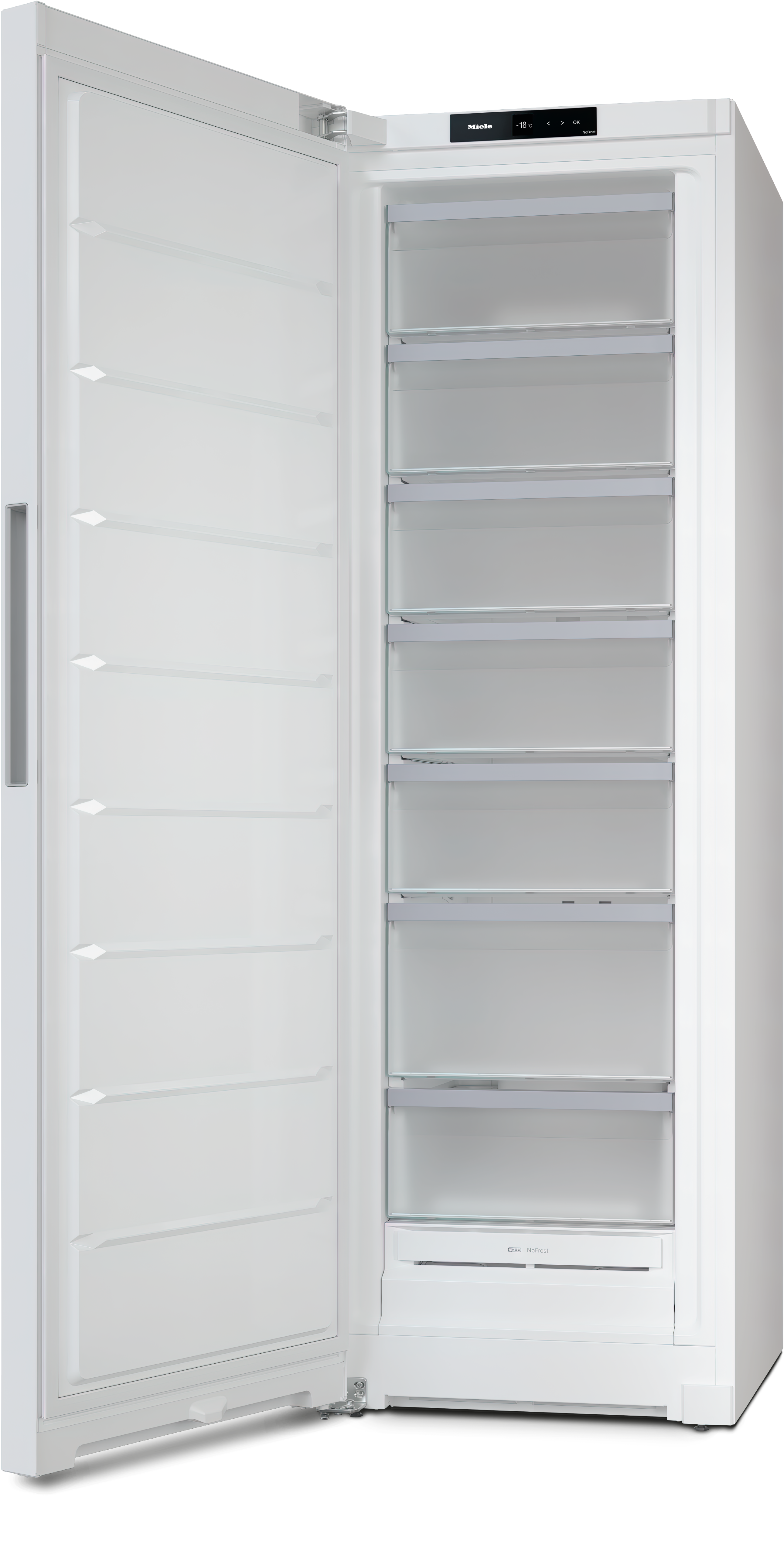Отдельно стоящая морозильная камера с системами NoFrost и SideOpen для удобного размещения рядом друг с другом.