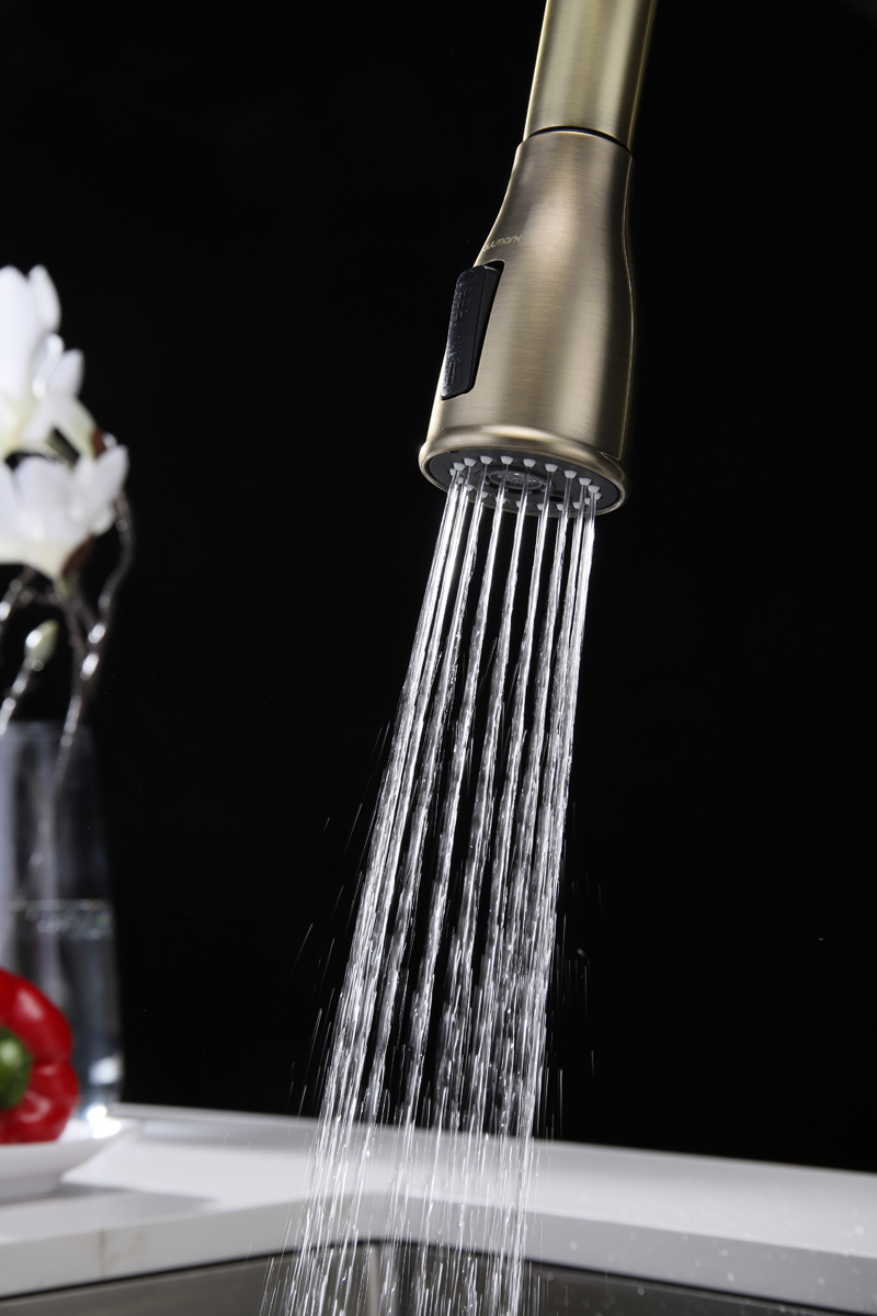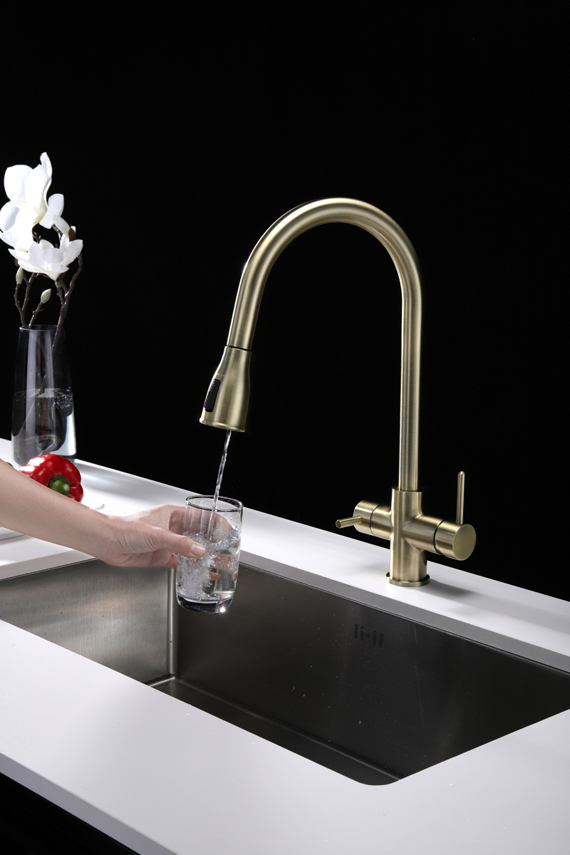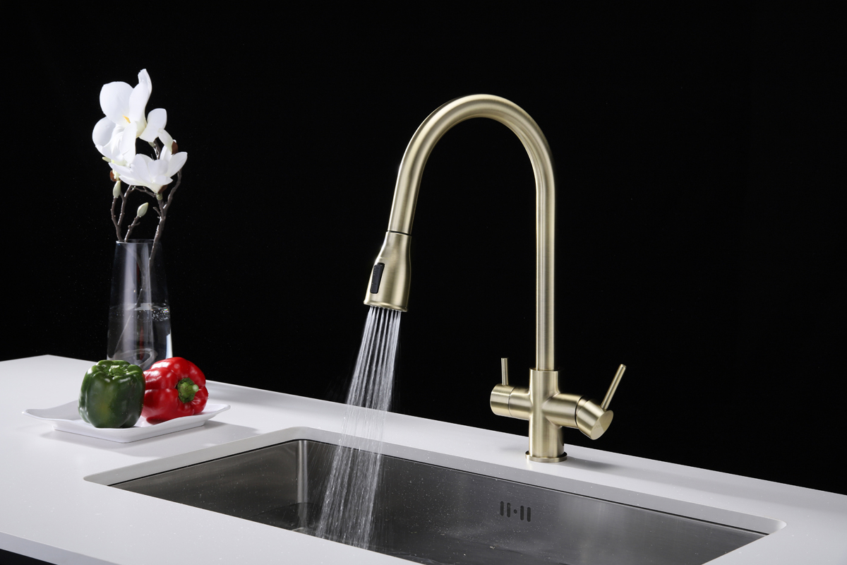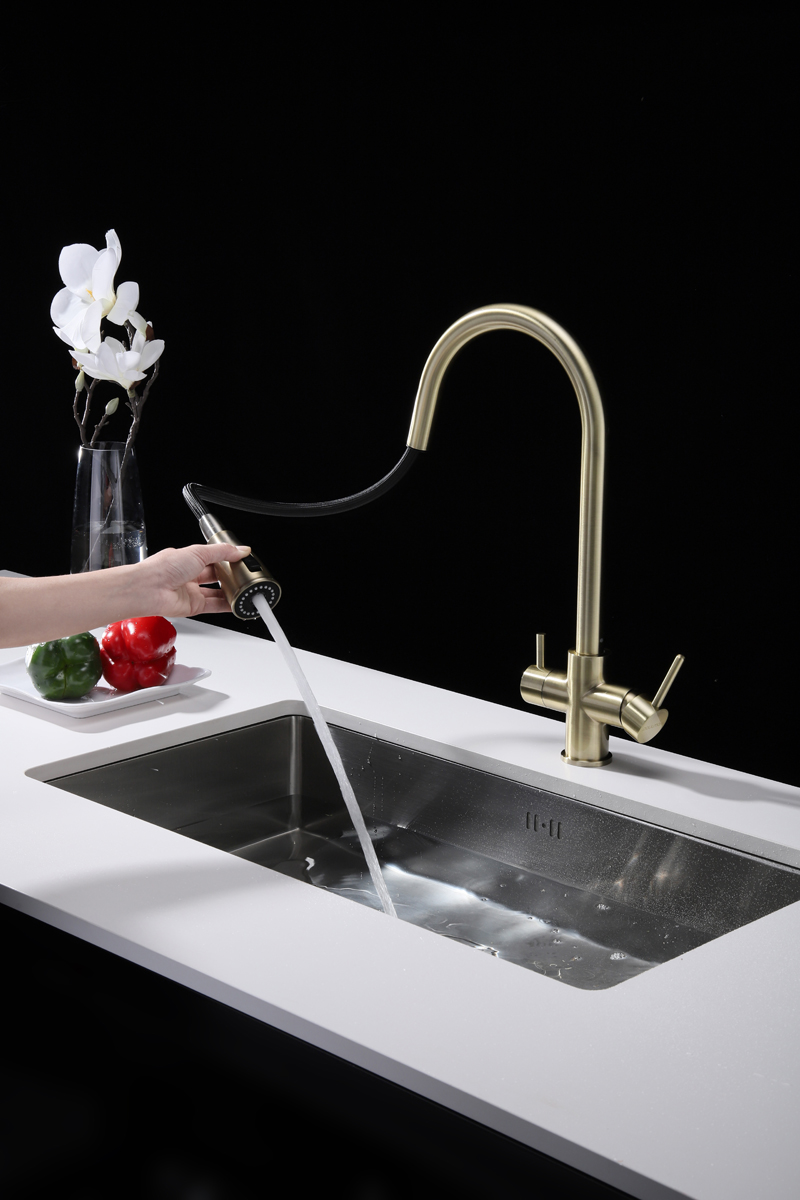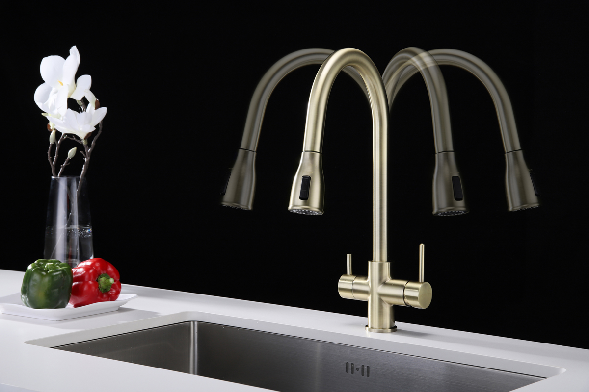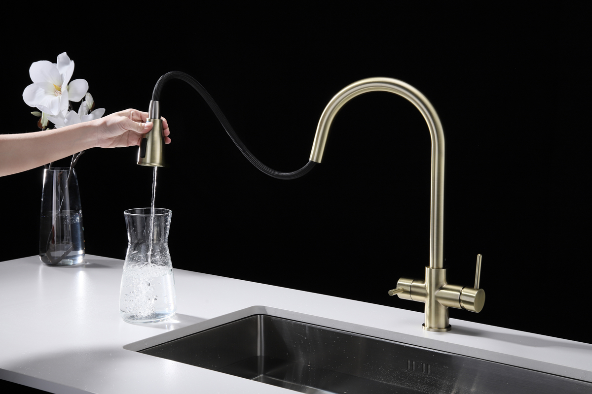 Смеситель LANGE оснащен функциями подключения фильтра питьевой воды, выдвижения излива и двумя режимами подачи водопроводной воды: струя и душ.