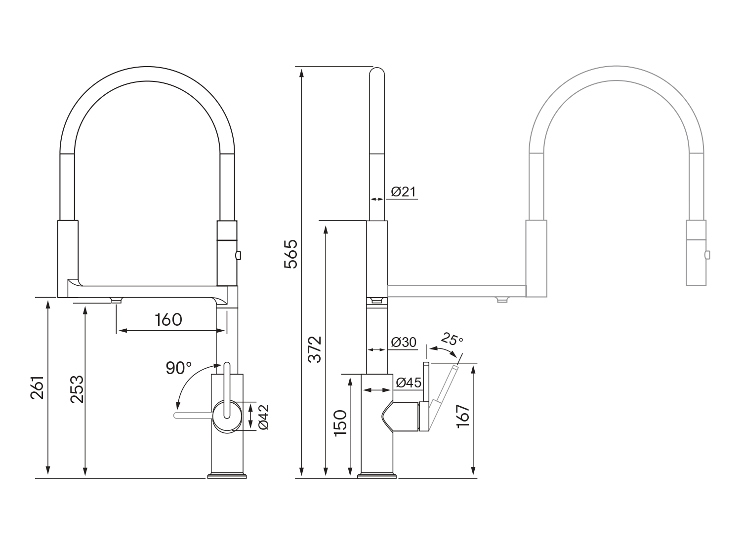 Гибкий силиконовый излив оснащен функцией деликатного душа и магнитным механизмом фиксации в задней части латунного корпуса. Он позволяет ополоснуть посуду или мойку в любой ее части или наполнить емкости даже на столе рядом с мойкой.