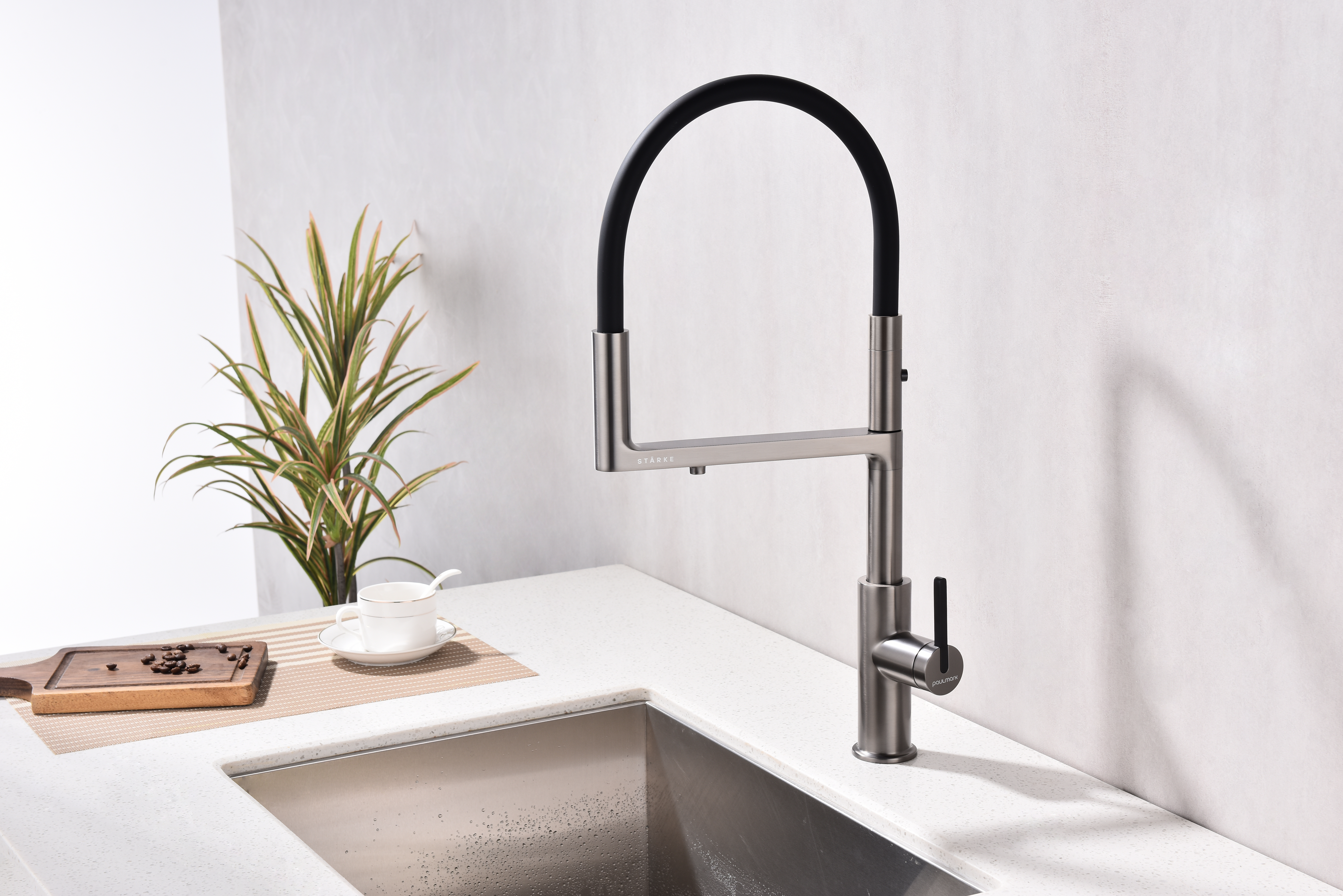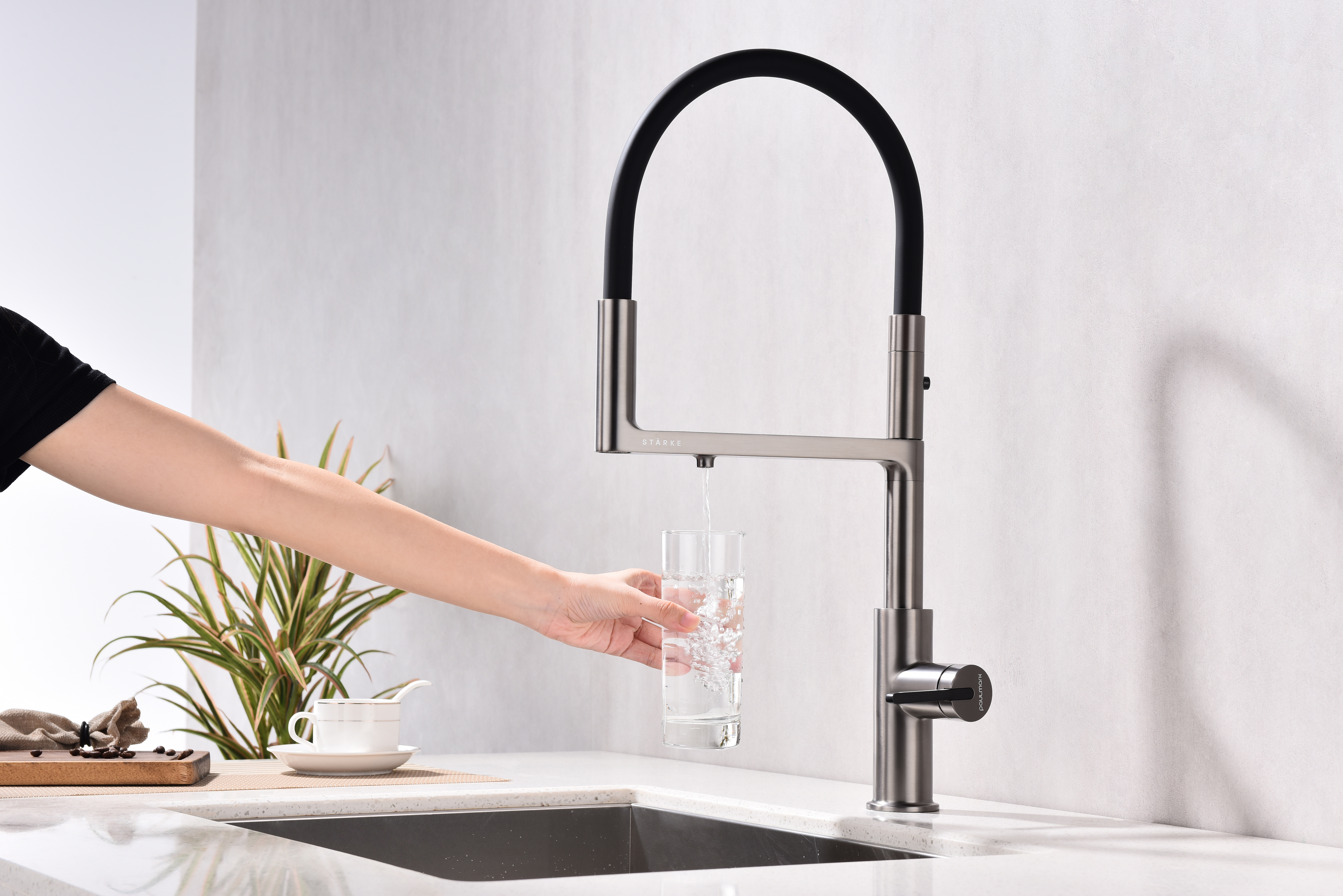 Многофункциональный смеситель для кухни TORNADO – модель премиальной серии «Starke» кухонной сантехники бренда Paulmark изготовлен из высококачественной латуни, которая отвечает высочайшим европейским стандартам качества, не содержит свинца, не разрушается со временем и безопасна для здоровья.