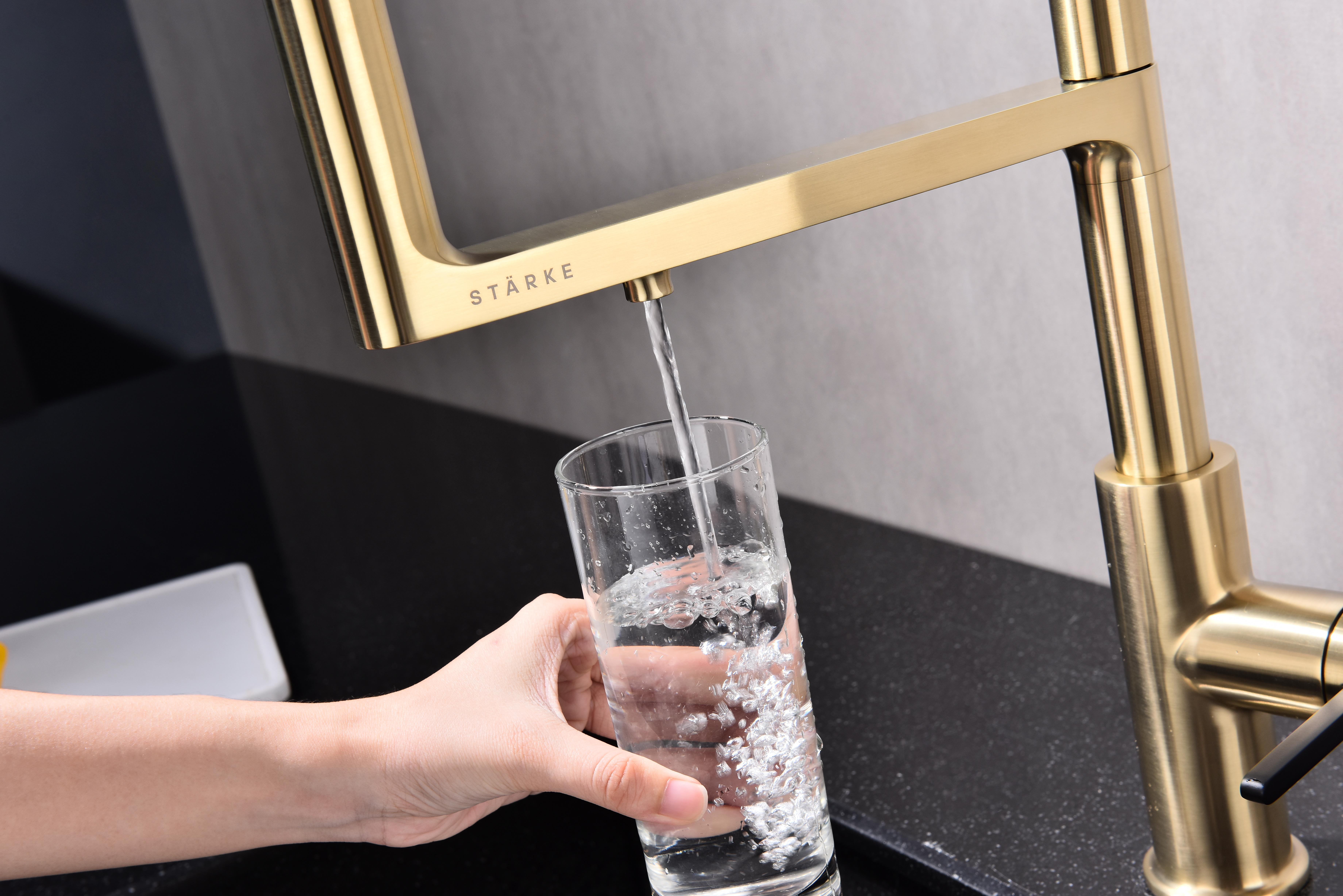 TORNADO оснащён функцией TRINKWASSER – в смесителе присутствует встроенный независимый канал для питьевой воды из фильтра, которая подается из отдельного аэратора на латунной части излива. Водопроводная вода подаётся из гибкого силиконового излива. Управление питьевой водой производится рычагом слева. Рычаг справа управляет подачей водопроводной воды. Совмещение подачи питьевой и водопроводной воды в одном смесителе избавляет от необходимости ставить дополнительный кран и позволяет сделать зону мойки максимально эстетичной.